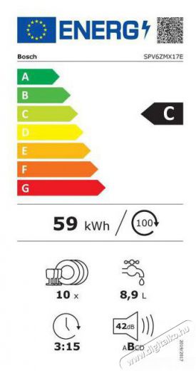 Ez az adott BOSCH SPV6ZMX17E Serie 6 beépíthető mosogatógép a következő energiaosztályba tartozik: C. Ezenkívül alacsony energiafogyasztás mellett magas mosogatási minőséget garantál. Az ECO program energiafelhasználása kb. 59 kWh. Ciklusonként legfeljebb 10 teríték mosogatható el vele. Egy ECO mosogatási ciklus időtartama: 3,25 óra. A mosogatógép sokkalta kevesebb vizet fogyaszt, mint amennyi elhasználódik a kézi mosogatás közben. Az ECO program ciklusonkénti vízfogyasztása: 8,9 l. Eme Bosch beépíthető mosogatógép méretei 81,5 × 44,8 × 55 cm (magasság × szélesség × mélység).