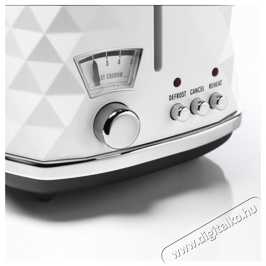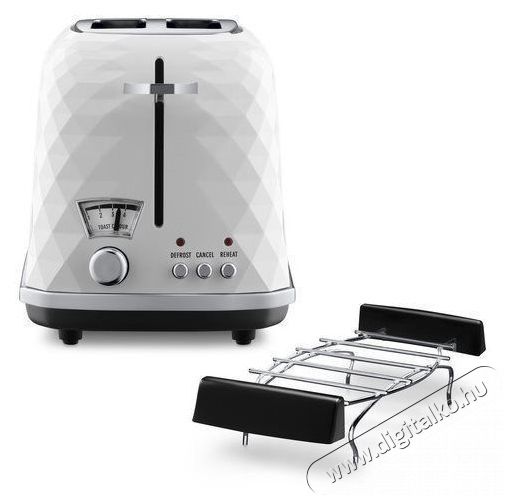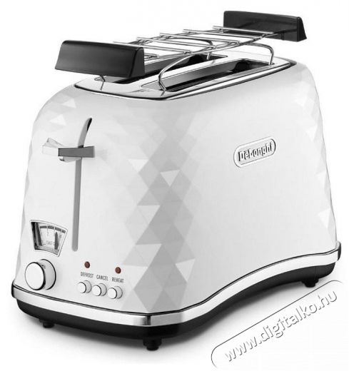 De`Longhi CTJ 2103. W kenyérpirítóA De`Longhi CTJ 2103. W kenyérpirító a De`Longhi Brillante termékcsaládból származik, amelynek célja az időtlen formatervezés elérése a jelen minőségének és eleganciájának megőrzése mellett. A csúszásgátló lábak garantálják a biztonságot. A kenyérpirító műanyag teste krómozott részletekkel rendelkezik. Ha kis kenyereket pirítasz, jól jön a könnyebb eltávolítást lehetővé tevő magasabb emelési lehetőség.