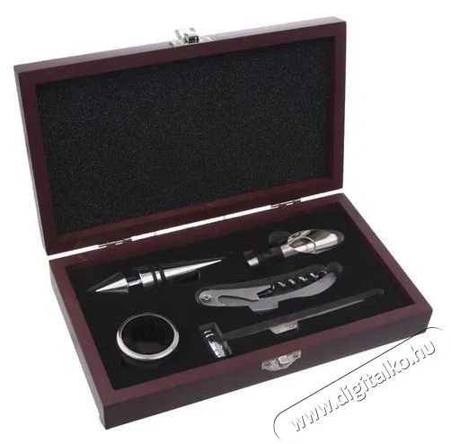 Borozó szett - rozsdamentes acél, üveg, fa. A készletben található késsel ellátott összecsukható dugóhúzó, szalvétagyűrű, dugó, tölcsér, hőmérő. Méretek: 23 × 13 × 4,5 cm.
