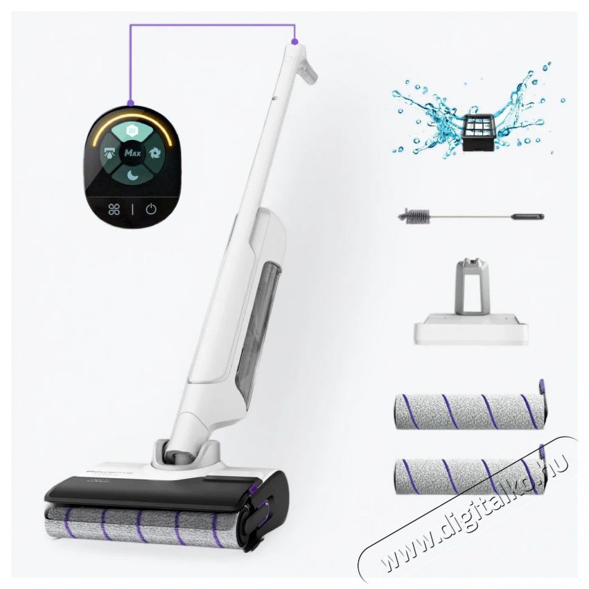 A ROWENTA GZ7540WO X-Clean 10 álló porszívó nagyszerű segítségeddé válik az egész ház tökéletes kitakarításában. Fedezd fel a takarítás forradalmi módját a vezeték nélküli nedves/száraz porszívóval! Az all-in-one funkcióval egy menetben porszívózhatsz és törölhetsz fel, ezáltal időt takarítasz meg, és otthonod minden szegletét lefedheted. A mindössze 0,8 kg súlyú, 180 fokban rugalmas kialakítású, önjáró rendszer megkönnyíti a tisztítást. Élvezd a hosszú, akár 60 perces üzemidőt és a töltésenkénti akár 400 m²-t - ideális a gyors és alapos tisztításhoz. Az öntisztító rendszernek köszönhetően a készülék maga gondoskodik a takarításról és a felszárításról, megszüntetve a baktériumokat és a szagokat. A modern technológiák, köztük az intuitív vezérlés, a hangsegéd és az automatikus szennyeződésfelismerés még egyszerűbbé teszik tisztítási folyamatot. Legyen szó hajról, szőrről vagy szennyeződésről, a gubancolódásmentes hengeres kefe tökéletes eredményt ígér. A kényelem és a minőségi részletek biztosan elvarázsolnak - minimalista kialakítás, kettős szűrés, csendes működés és ergonomikus kezelőszervek a maximális kényelem érdekében. Tökéletes tisztaság minimális erőfeszítéssel! A csomagban mindent megtalálsz, ami az azonnali tisztításhoz szükséges - porszívó, töltőalap, tisztítókefe, töltő és kiegészítő henger.