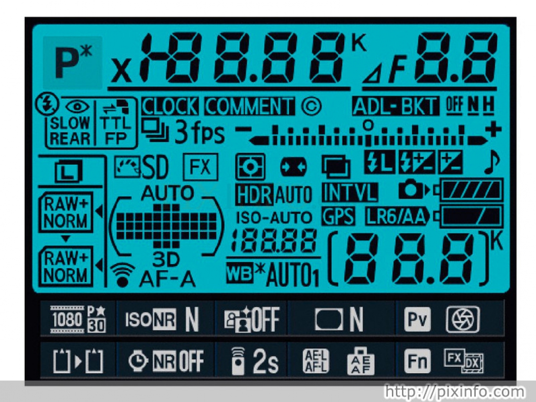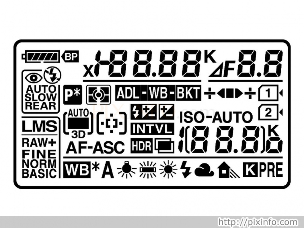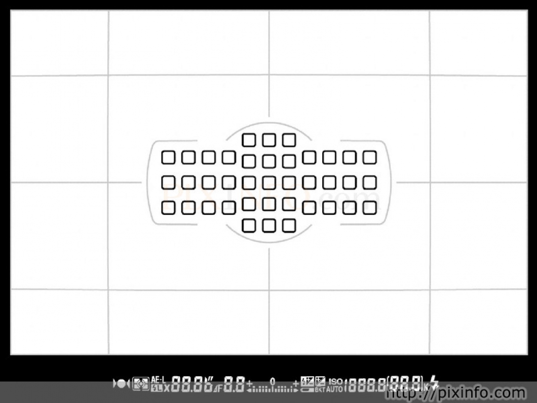 A mattüvegen az új modellekhez hasonlóan több adat is kijelzésre kerül. Látjuk az összes aktív fókuszpontot, a fókuszterületet, a középső fénymérési területet, a kompozíciós segédrácsot, képkivágásos formátumoknál pedig a képmező aktuális határát jelző vékony keretet. A képmező alsó részén egy skála jeleníti meg a virtuális horizontot, ha azt az Fn gombra programozzuk. A további felvételi információk az alsó státuszsoron olvashatók.