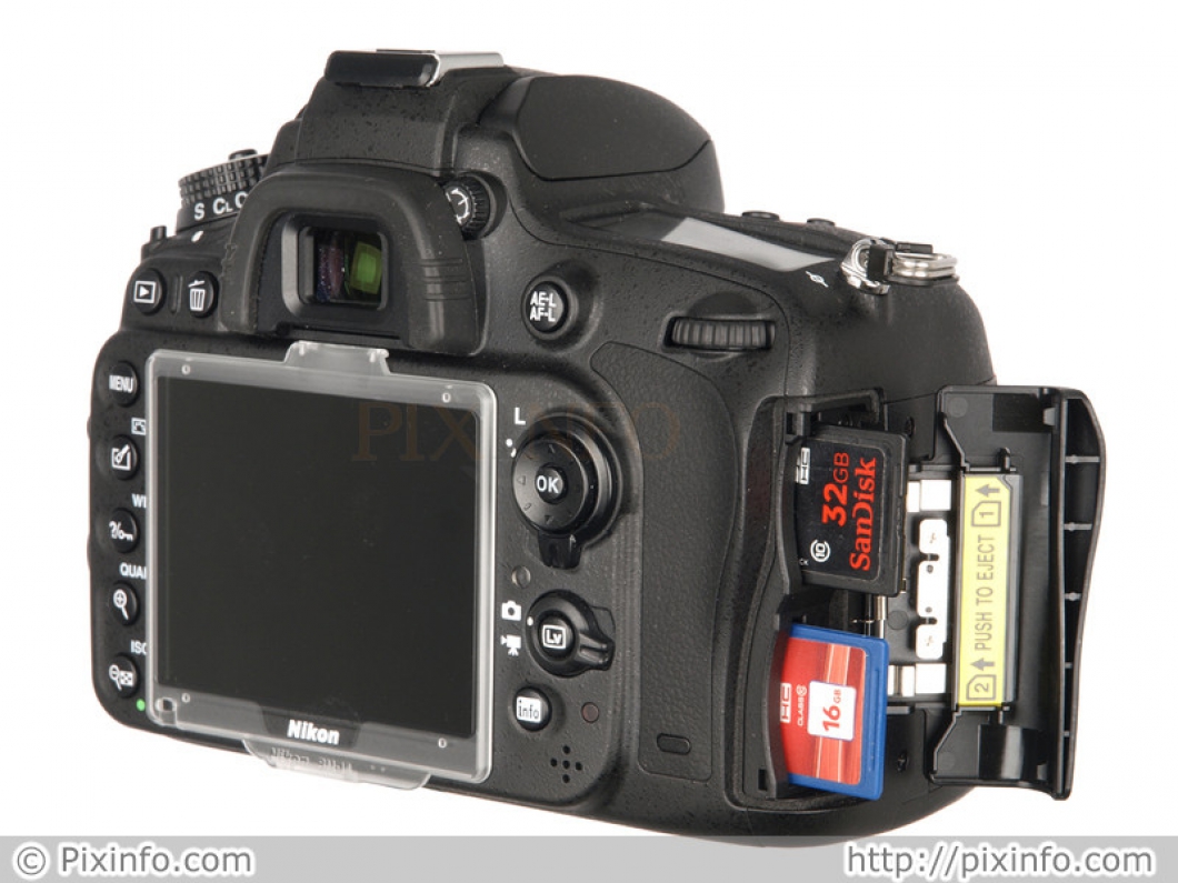 A Nikon D600-ba is két kártyafoglalat került, ahogyan a D800-ba is. Mégis van különbség a két gép között, hiszen a D800 CompactFlash és SD kártyákat is támogat, míg a D600-ba csak SD kártyát helyezhetünk, ezekből azonban kettőt is. A készülék egyébként támogatja az SDXC memóriakártyákat és az UHS-1 nagy sebességű adatátvitelt is. A menüben kiválasztható, hogy melyik kártya legyen az elsődleges. Külön szabályozható, hogy a videókat melyikre kívánjuk menteni. Ezen felül három működési módot is megadhatunk nekik. Overflow módban az elsődleges kártya beteltekor a másodlagoson folytatódik a mentés, Backup módban képeink és videóink mindkét kártyán elmentésre kerülnek, így lesz egy biztonsági másolatunk is. RAW/JPEG módban az egyik kártyára csak JPEG, a másikra csak RAW képek kerülnek. A két kártya között tetszőlegesen másolhatunk is, de nem csak a teljes tartalmat, mint általában a hasonló szolgáltatásoknál. Külön könyvtárak tartalmát, sőt törlésvédetté tett fotókat is másolhatunk.