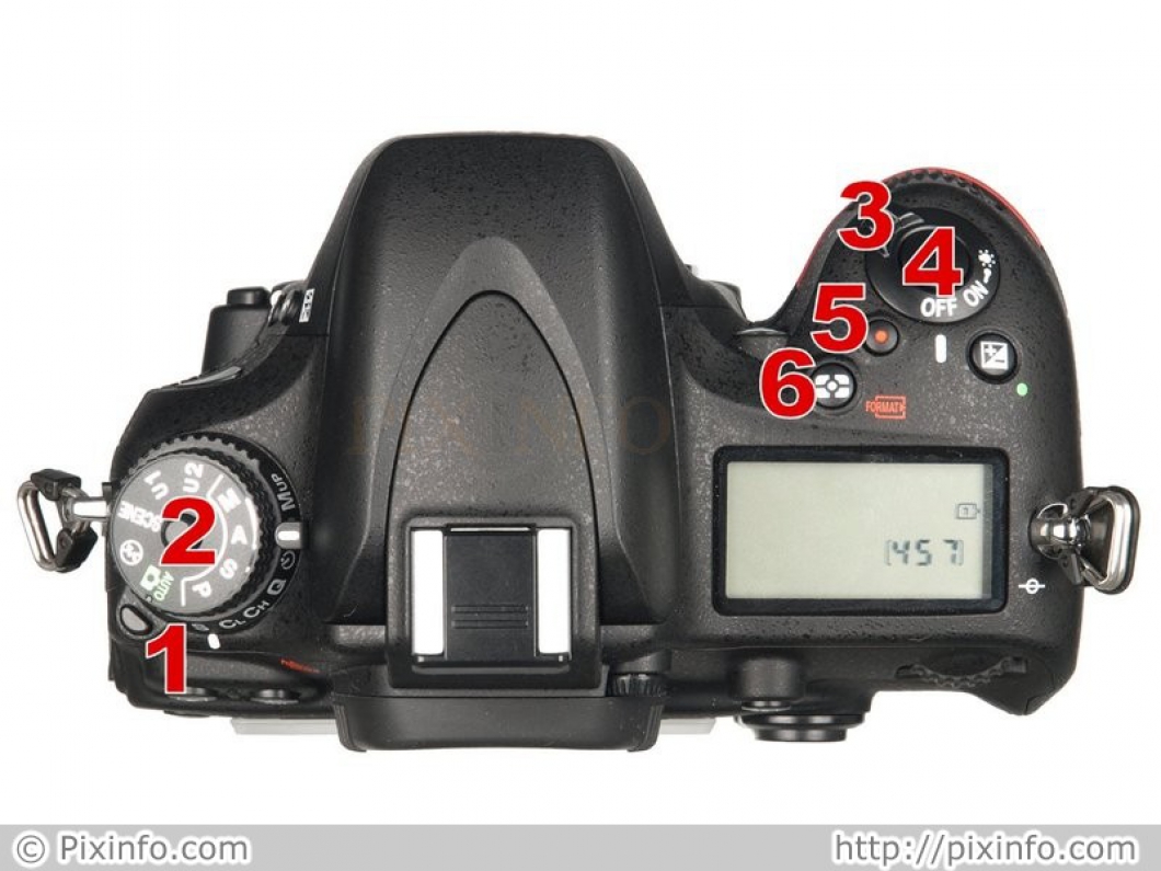 (3) Bekapcsoló gyűrű: a fényképezőgép ki- és bekapcsolására szolgál. A harmadik állás a felső státusz LCD háttérvilágítását aktiválja, vagy kikapcsolja.
