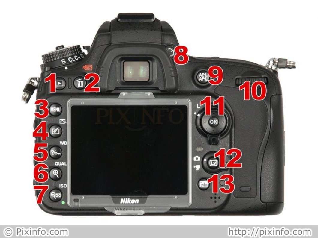 (1) Lejátszás gomb. A memóriakártyákra mentett felvételek és videók megtekintéséhez használható. A Playback menü csak ebben a módban érhető el. Ismételten lenyomva visszajutunk felvételi üzemmódba, de az exponáló gomb félig lenyomásával is visszakerülhetünk.