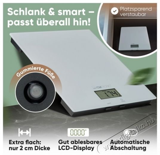 • Helytakarékos kialakítás – A mindössze 2 cm magas mérleg különösen lapos, és bármilyen konyhában könnyen tárolható