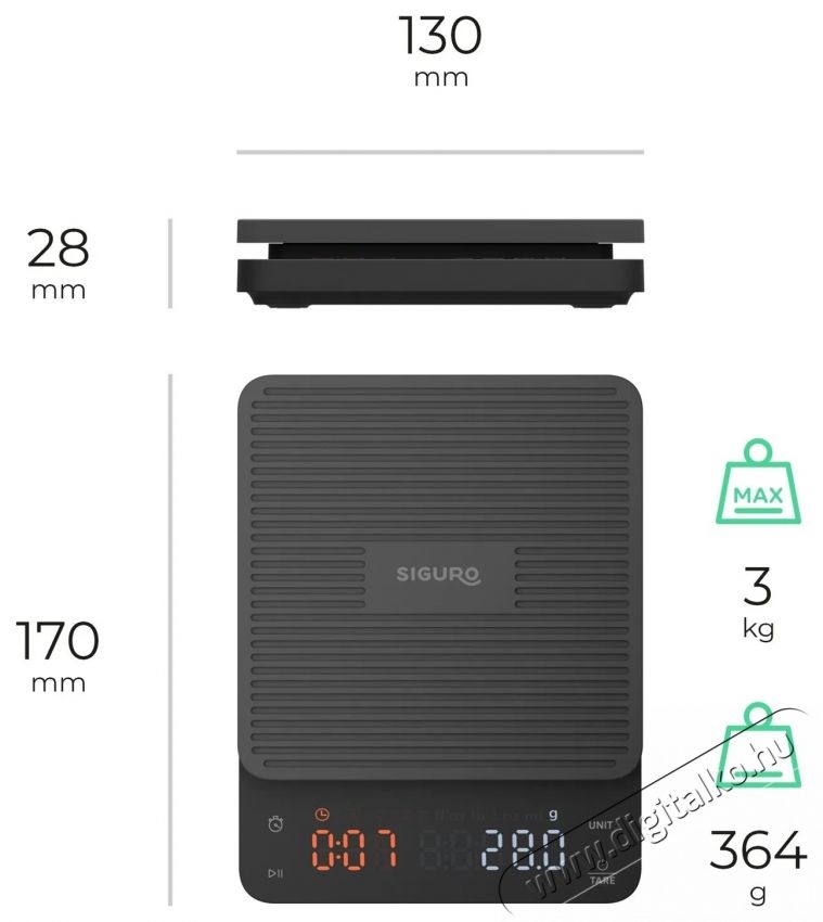 Készíts kávét, akár egy profi! A Siguro SC-F840B Coffee Gourmet Barista mérleggel modern matt kivitelben nemcsak a szükséges kávé vagy víz pontos mennyiségét mérheted le, hanem a beépített időzítőnek köszönhetően a kávé extrakciós idejét is. A mérleg emellett választható mértékegységeket, kétszínű LED-es érintőképernyőt, levehető szilikon mérőfelületet és még sok más funkciót kínál. Ez a mérleg kezdők és tapasztalt baristák számára egyaránt alkalmas.