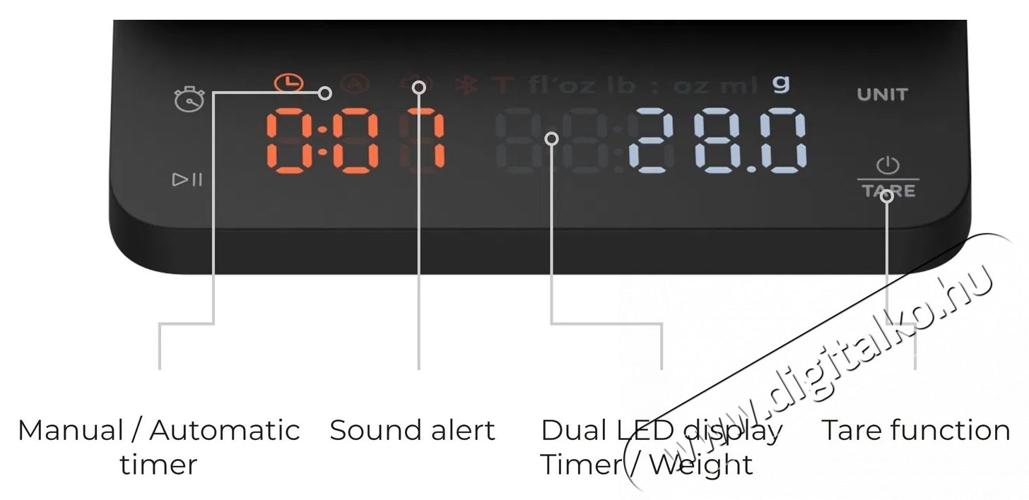 A Siguro SC-F840B Coffee Gourmet barista mérleg intuitív érintésvezérlője megkönnyíti a mérlegelést és az időzítő gyors beállítását, hogy az extrakcióhoz szükséges időt pontosan be tudd tartani. Mindezt egy két színű kijelző egészíti ki - a piros háttérvilágítású bal oldali rész mutatja az időt, a fehér háttérvilágítású jobb oldali rész pedig a mért értékek megjelenítésére szolgál. Értékelni fogod, hogy a kijelző bármilyen fényviszonyok között tökéletesen olvasható. Az időzítő funkció automatikusan elindul, amikor a súly változik, vagy manuálisan.