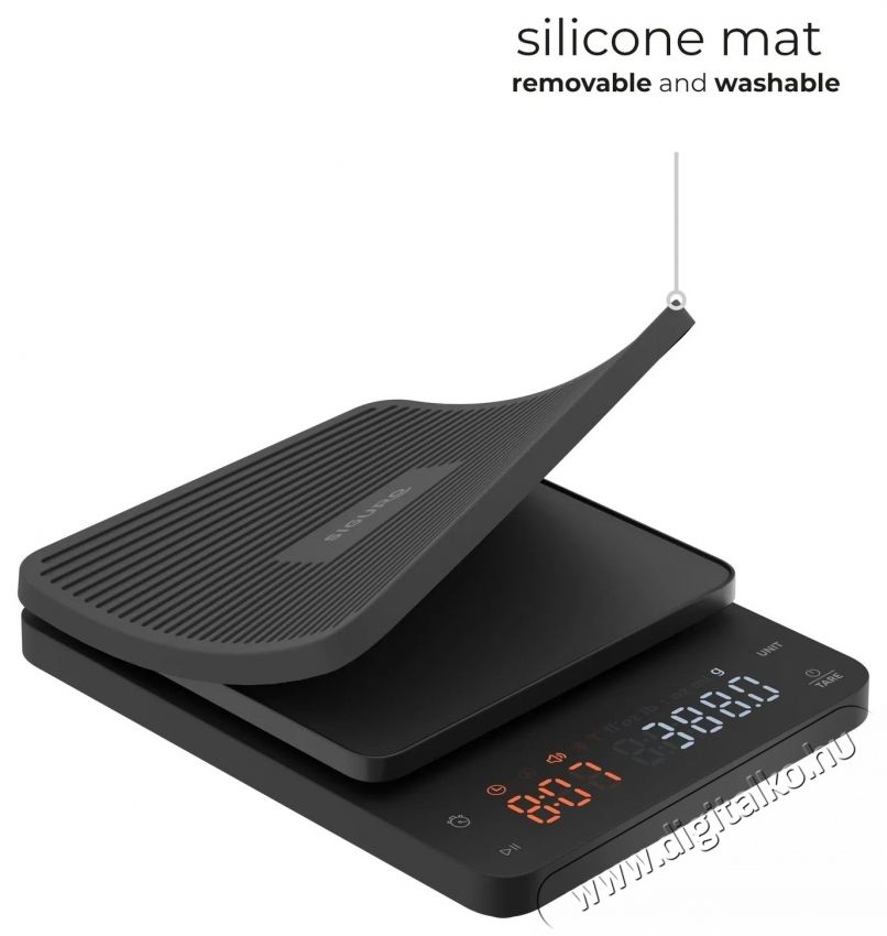 A Siguro SC-F840B Coffee Gourmet barista mérleg nagy előnye a levehető szilikon mérőfelület, amely vízálló és nagyon könnyen mosható. Ezenkívül csúszásmentes és mindenekelőtt hőszigetelt, így biztonságosan ráhelyezheted a mérlegre példáula kannát az éppen lefőtt kávéval. Természetesen csúszásmentes lábakkal rendelkezik a konyhapulton vagy asztalon való maximális stabilitás érdekében.