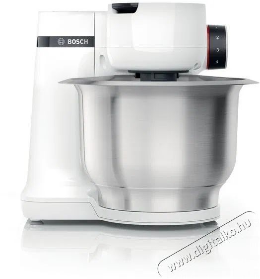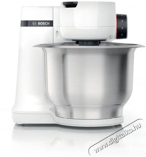 strapabíró rozsdamentes acél tállal, melynek térfogata 3,8 l, amely minden többszemélyes háztartás számára megfelelő. A strapabíró Bosch konyhai robotgép megjelenését fehér szín tökéletesíti.