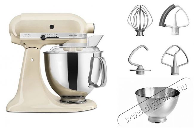 KitchenAid Robot Artisan 175 MandulaszínűSpórolj időt, és szerezz örömöt a főzés során az új KitchenAid Robot Artisan 175 fekete konyhai robotgéppel. 300 W-os motorral látták el, mellyel könnyedén elvégezhetjük az olyan alapvető műveleteket, mint keverés, habverés, reszelés és könnyebb tészták dagasztása. A motor teljesítményét könnyedén tudjuk szabályozni 10 előre meghatározott fokozatban, így olyan gyorsaságot választunk, amire éppen szükség van. A bolygómozgásnak hála, amikor is az alapanyagok keverése közben a robotfej és a keverőfej egymással ellenkező irányban mozog, a robotgép nagyszerű végeredményt biztosít. A kényelmes tésztával való munka érdekében a robotgépet ellátták egy tágas tállal, melynek térfogata 4,83 l, amely megfelelő minden többszemélyes háztartás számára. Az ügyes KitchenAid konyhai robotgép külalakját fekete szín tökéletesíti.