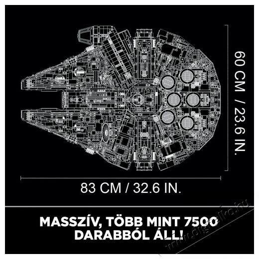 Hagyd, hogy magával ragadjon a külső és belső tér lenyűgöző kifinomultsága, ahonnan semmi sem hiányzik, ami az igazi Millenium Falcon filmben megvan! Megtalálhatóak itt az alsó és felső rész négycsövű lézerágyúi, a leszálló talpak, a lehajtható rámpák és a levehető tetejű pilótafülke 4 minifigura számára. Az egyes hajótest panelek alatt, a törzsben található a részletesen kidolgozott, fő rakománytér, a hátsó tárolóhely és a tüzérségi állás is.