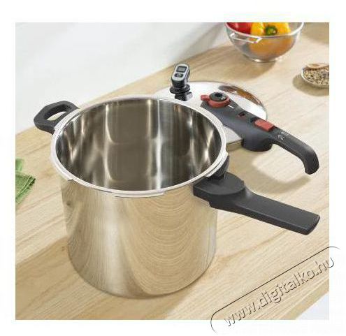 Kukta - 8 l űrtartalom, bajonettzár, 2 szelep, 2 főzési program, párolókosár, 3 rétegű edényalj, 18/10 rozsdamentes acél, kiváló minőségű műanyag fogantyú, bármilyen hőforrással kompatibilis, beleértve az indukciót, mosogatógépben mosható (fedő és időzítő nélkül), 5 biztonsági pont, szín: rozsdamentes acél és fekete, 10 év garancia az edényre, 15 év javíthatósági garancia.
