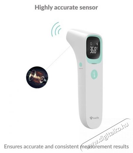 Pontos, gyors és kényelmes mérés A TrueLife Care Q10 BT hőmérővel nem kell sokáig várnia, a gomb megnyomásától számított 1 másodpercen belül megkapja az eredményt. A hőmérő infravörös technológiát használ, és 0,1°C-os pontossággal méri a hőmérsékletet. Az érintésmentes mérés ráadásul higiénikus és egyúttal kényelmes is; elég a hőmérőt a homlok közepére irányítani, és megnyomni a gombot. Ha meg kell mérnie a baba lázát, nem kell hozzá felébresztenie. A színes jelzőfény lámpa felkapcsolása nélkül is figyelmeztet a megemelkedett hőmérsékletre.