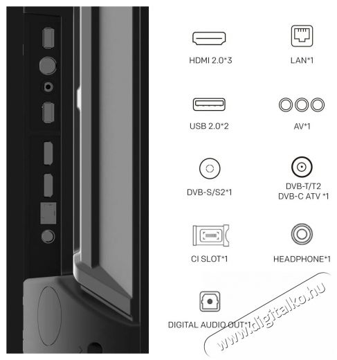 | Be- és kimenetek | Audio analóg bemenet, CI+, Digitális optikai/digitális hangkimenet, Fejhallgató kimenet, HDMI 2.0, LAN, USB |