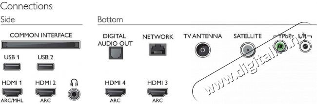 - Egyéb csatlakozások: Antenna IEC75, Műholdas csatlakozó, Általános interfész plusz (CI+), Digitális audiokimenet (optikai), Ethernet-LAN RJ-45, Audió L/R bemenet, Fejhallgató-kimenet