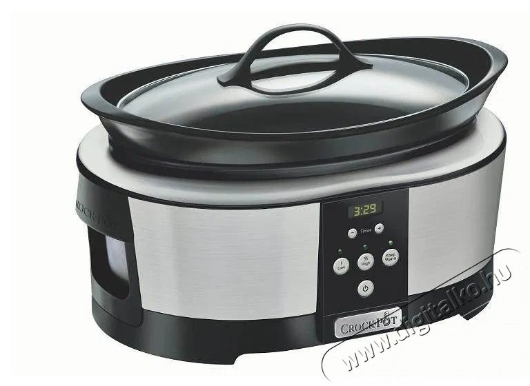 Lassúfőző - űrtartalma 5,7 l, a felszerelés része kijelző, kivehető edény, időzítő, hőmérséklet megtartása és dupla főzés, kerámia belső felület, 250 W teljesítmény, fedő a csomag része, mérete 26 × 36 × 29 cm (Ma×Sz×H), tömege 6,1 kg, inox kivitel