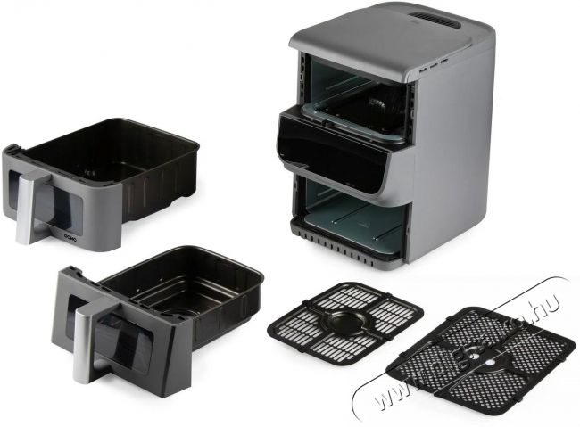 DOMO DO550FR A minőségi DOMO Airfryer segít elkészíteni kedvenc ételeinket a lehető legkevesebb zsiradék hozzáadásával. Az olajmentes fritőz tartályának a szabványosnál nagyobb az űrtartalma, konkrétan 10 l. Ezért egy azon időben akár 2 kg finomságot is elkészíthetünk segítségével. A sütőtartály kivitele rozsdamentes acél, amely nem csak kiváló minőséget, hanem hosszú élettartamot is kínál. Attól függően, hogy éppen milyen étel készül, 80 és 200 °C között szabályozhatod a sütés hőfokát. A meleglevegős fritőz 2500 W teljesítményével a levegő gyorsan felmelegszik és optimális üzemi körülmények uralkodnak a teljes használat során. A hőmérséklet és a sütési idő manuálisan is beállítható, vagy választhatsz 10 előre beállított sütési program közül. 2 fritőzkosarat is kapunk, amelyeknek köszönhetően egyszerre több különböző ételt készíthetünk. A fritőz mellett a csomagban található kivehető edény és pléh.