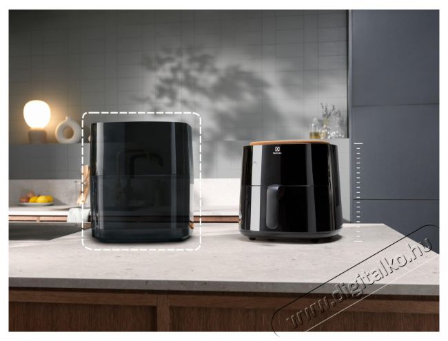 Tedd egészségesebbé a sült ételeket az Electrolux forrólevegős fritőzzel Egészségesebb módon készítenéd el az ételeket? Ez lehetséges az Electrolux EAF5B forrólevegős fritőzzel. Az ételek akár 90%-kal kevesebb zsírt és 50%-kal kevesebb kalóriát tartalmazhatnak*. Lehet sütni, grillezni, olajban sütni - a képzeletnek nincsenek határai. A dinamikus meleglevegő-keringtetési technológiának köszönhetően az ételek gyorsabban sülnek meg, mint ami egy hagyományos sütőben lehetséges lenne. Az Electrolux EAF5B forrólevegős fritőz vezérlése érintéses vezérléssel történik, és a könnyen leolvasható kijelzőn láthatod az összes beállítást és a hátralévő főzési időt. 8 előre beállított programmal rendelkezik, csak kapcsold be, és a forrólevegős fritőz magától gondoskodik az ételkészítésről. Főzés közben figyelmeztet az ételek keverésére/rázására, hogy a legjobb sütési/sütési eredményt érje el. Az 5 literes kapacitás akár 1,4 kg sült krumpli elkészítését is lehetővé teszi. Az Electrolux EAF5B kompakt méretének köszönhetően megtalálja a helyét A készülék könnyen illeszkedik bármelyik konyhába. Kompakt mérete ellenére az Electrolux forrólevegős fritőz 5 literes űrtartalommal rendelkezik, így könnyen elfér benne 1,4 kg sült krumpli. Az elegáns fekete dizájn akkor is kitűnik a konyhában, ha közvetlenül a konyhapulton hagyod. Az Electrolux EAF5B készüléket könnyű használni a kijelzőnek és az érintőképernyős kezelőszerveknek köszönhetően. Az automatikus programok megkönnyítik az ételkészítést Könnyítsd meg a különféle ételek elkészítését a 8 előre beállított programmal. A kiválasztott programtól függően automatikusan beállítja a hőmérsékletet és a főzési időt. Természetesen mindkettőt manuálisan is beállíthatod a saját preferenciáidnak megfelelően. A sütési idő 0-99 perc között, a hőmérséklet pedig 60 és 200 °C között állítható. Az Electrolux forrólevegős fritőz könnyen tisztítható A forrólevegős fritőz minden kivehető alkatrésze egyszerűen mosogatógépben mosható, ami megszabadít a fáradságos kézmosástól. A nem tapadó felület biztosítja, hogy az ételek nem tapadnak az Electrolux EAF5B forrólevegős fritőz belsejéhez. Az Electrolux EAF5B emlékeztetni fog, hogy rázd meg az ételt A forrólevegős fritőz a sütési idő felénél emlékeztetni fog, hogy meg kell keverni az ételt. Nagyra fogod értékelni ezt a praktikus funkciót, amikor sült krumplit, amerikai burgonyát és más olyan ételeket készítesz, amelyeket egyenletesen és szépen szeretnél megsütni. Az Electrolux EAF5B forrólevegős fritőz kosara könnyen kivehető. Egyszerűen nyomd meg a gombot a retesz kioldásához, és húzd ki a kosarat. Praktikus Multi Coaster kiegészítők Könnyítsd meg az ételkészítést az Univerzális Multi Coaster alátét segítségével, amelyet az Electrolux EAF5B forrólevegős fritőzzel együtt kapsz. Tároló tányérként szolgál a sütőkosár, a konyhai eszközök vagy a fűszerek számára. A tányér levehető, és közvetlenül a forrólevegős fritőz forró kosarából tálalható az étel.