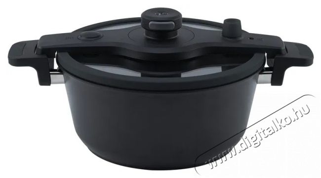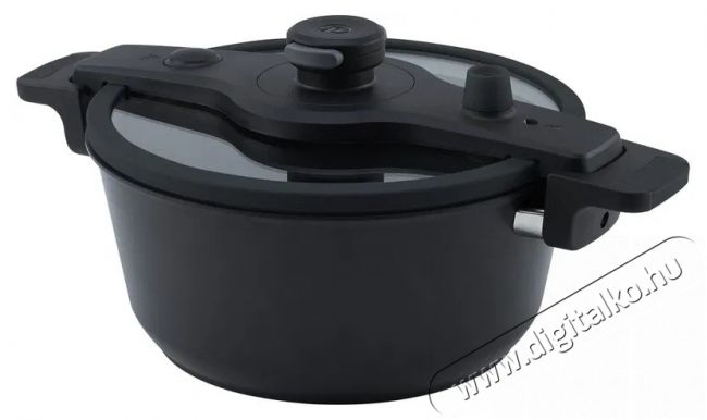 Alacsony-nyomású fedő:Lassú, nyomás alatt történő főzéshez, ideális pörkölt, húsleves és sok más étel főzéséhez. Az egyedülálló szabadalom lehetővé teszi az egykezes nyitást és zárást. A fedő edzett biztonsági üvegből készül, szilikon tömítéssel. A fedőn egy vezérlőszelep található szilikon fedéllel és biztonsági szeleppel. A mérsékelt nyomáson végzett enyhe főzésnek köszönhetően minden vitamin és tápanyag megmarad.