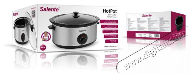 Salente HotPot lassúfőzőFedezd fel a lassú főzés varázsát a Salente HotPot lassúfőzővel, egy okos és stílusos segítővel, amelynek űrtartalma 6,5 liter, így akár 15 adag finom ételt is elkészíthetsz benne, a zamatos pörköltektől az illatos leveseken át a házi lekvárokig. A kerámiaedény a mázzal és a dupla falú alumíniummal egyenletesen elosztja a hőt. A Salente HotPot lassúfőző két főzési módot (LOW és HIGH) és akár 4 órán át tartó hőmérséklet-tartási funkciót kínál, így rugalmasan tervezheted meg az asztalnál töltött időt. Az AntiFingerPrint felülettel ellátott elegáns rozsdamentes acél kialakítás és a hőszigetelt fogantyúval ellátott tartós üvegfedő stílusos és praktikus megjelenést kölcsönöz az edénynek. A Salente HotPot termikus biztonsági berendezéssel van ellátva, és megfelel a szigorú európai tanúsítványoknak, az 1230 °C-on égetett kerámiaedény pedig hosszú élettartamot garantál. Élvezd az egészséges, ízletes és könnyű főzést stressz nélkül és minimális zsiradékkal!