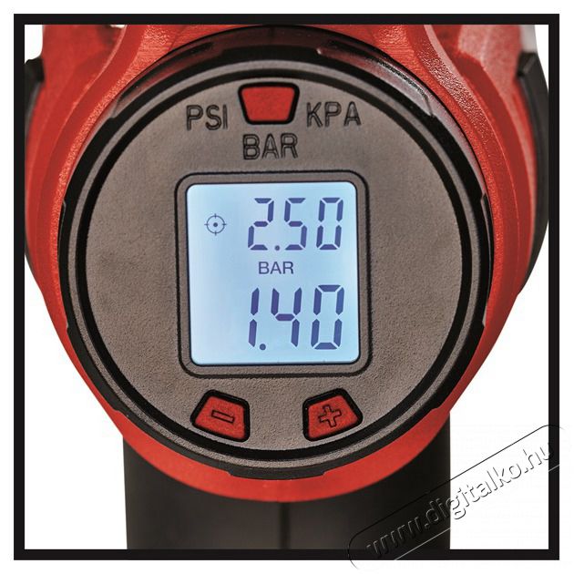 • Az akkumulátoros autós kompresszort digitális kijelzővel szerelték fel, amelyről egyszerűen és gyorsan leolvashatja az aktuális beállításokat. A kívánt nyomást – max. 11 bar értékig – egyszerűen beállíthatja. Ha eléri a beállított nyomást, a kompresszor automatikusan kikapcsol. A mértékegység-beállítást (bar, psi vagy kPa) a gomb megnyomásával változtathatja meg. Manuális pumpálásra is van lehetőség, ilyenkor nem kell előzetesen beállítania a nyomást.