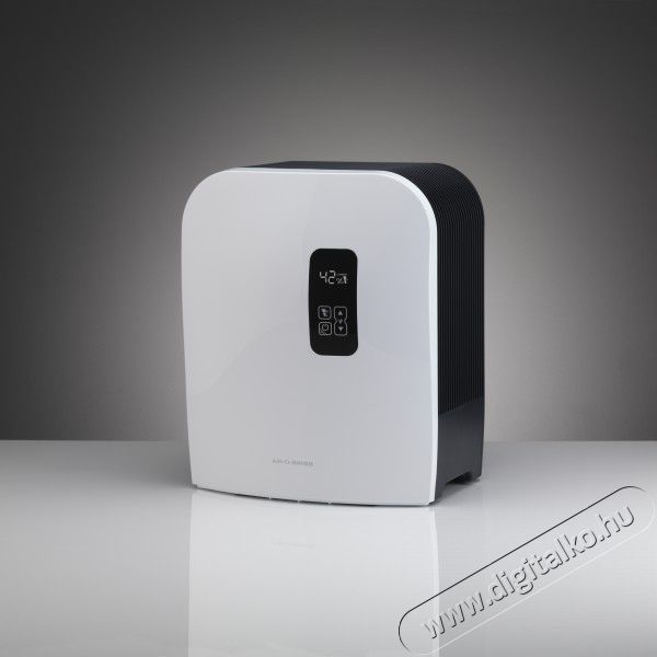 - Az AIR-O-SWISS természetes módon, gondoskodik az optimális, 50 % körüli páratartalomról, ám a beépített hygrosztátnak (páraszint érzékelőnek) köszönhetően, Ön is pontosan beállíthatja a kívánt páratartalmat, ekkor a légmosó a beállításoknak megfelelően ki-, ill. bekapcsol, akkor, amikor szükséges