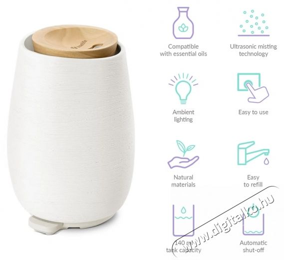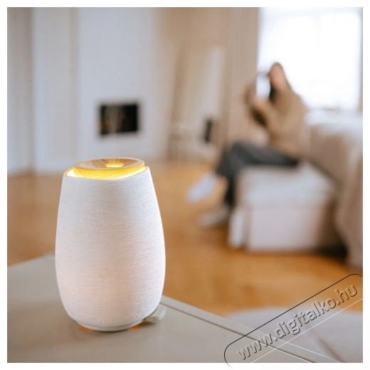 Az aromadiffúzor természetes anyagokból készült - kerámia test és fa tartályfedél. Az ultrahangos technológiának köszönhetően a víz finom köddé alakul, amely párásítja a levegőt és egyenletesen eloszlatja az illóolajok illatát. Az OilFlow® technológia biztosítja, hogy az aroma egyenletesen és intenzitás-ingadozás nélkül szabaduljon fel. Az eredmény egy természetesen frissítő környezet, amely pozitívan befolyásolja a hangulatot, a koncentrációt és az általános közérzetet.