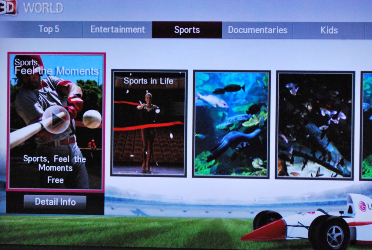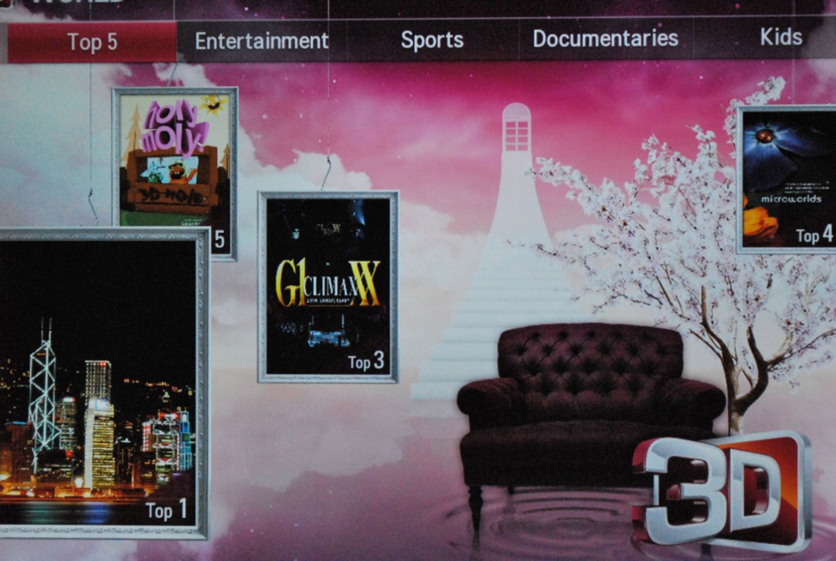 A Smart rendszerbe integrált 3D World szolgáltatás öt kategóriában kínál közel 150 filmet, magazin- és showműsort, klipet, ajánlót, animációs rövidfilmet. A kezelés pofonegyszerű, és a minőségre sem lehet panasz. Végül is igaza van az LG-nek, ha a stúdiók és tévétársaságok nem lépnek, akkor nekik kell tenni azért, hogy meggyőzzék a potenciális vásárlókat: igenis szükségük van 3D tévére. Ennek ráadásul megvan az a jó oldala, hogy a konkurencia nem is részesül ezen szolgáltatás előnyeiből.
