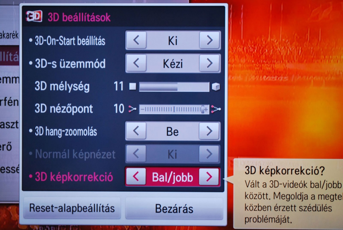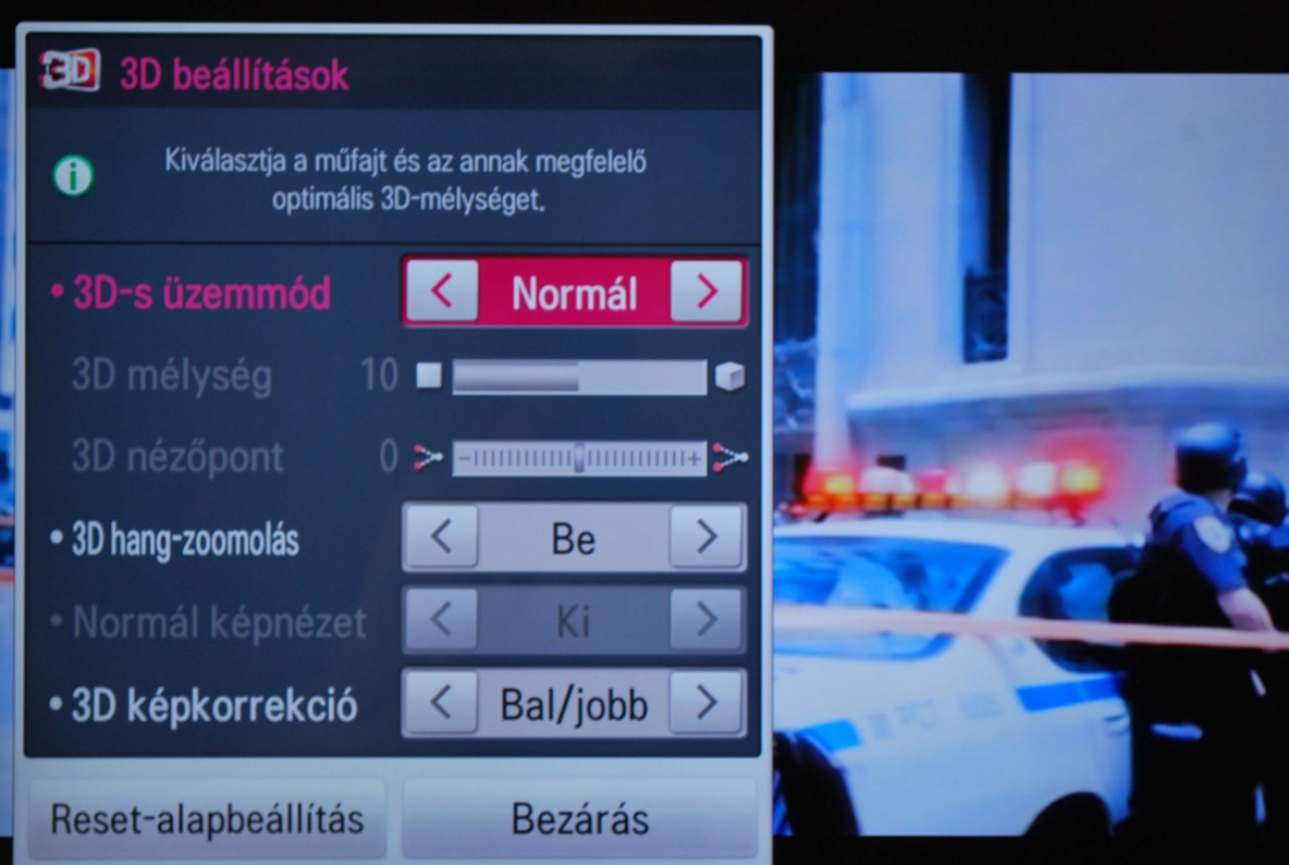 A készülék kezeli az összes létező szabványt, így a Blu-ray lemezeknél használt Frame-by-frame, valamint a Top-and-bottom (1920x540 pixeles felbontás), illetve a Side-by-side (960x540) formátumokat. A 3D képi beállítások köre meglehetősen sokrétű, hiszen a 3D mélység (az adott objektum és a háttér közötti távolságot szabályozza) és a 3D nézőpont (közelíti vagy távolítja a 3D képeket) is egy tízfokozatú skálán szabályozható. Emellett vannak előzetesen beprogramozott profilok is. Ezek közül a Mozi, a Normál és a Sport között nincs nagy különbség, ám az Extrém olyan, mintha egy frissen kifogott lazaccal csapnák pofon az embert. Emellett aktiválható az 3D hangzoomolás funkció, amely a csatlakoztatott házimozirendszereken a háromdimenziós képhez optimalizálja a hangot. Illetve bekapcsolható a 3D képkorrekció is, amelynek elméletileg az a feladata, hogy megszüntesse a szédülést, de mivel ilyen nálunk nem jelentkezett, ezért nem tudjuk, hogy ér-e valamit.