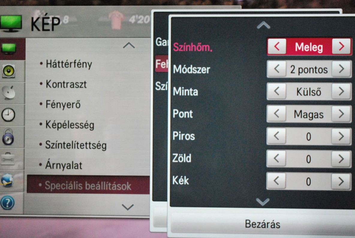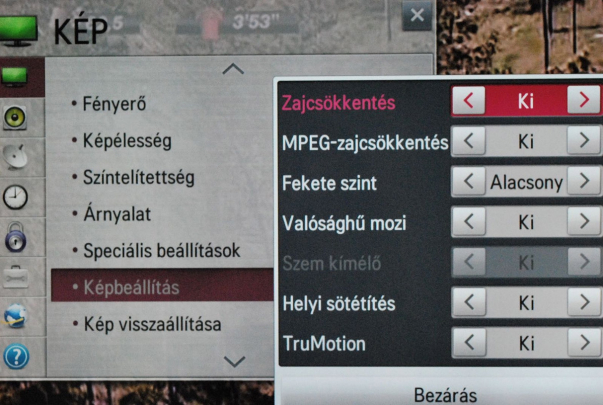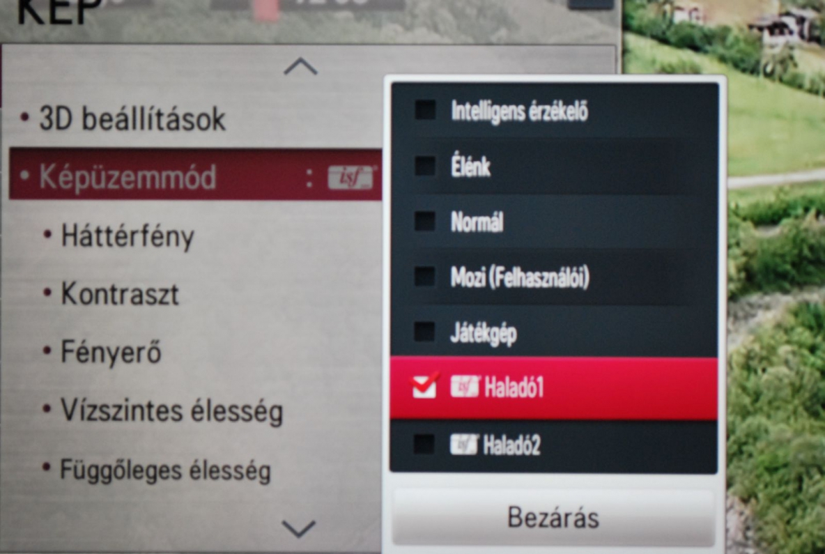 Öt előzetes képbeállítás, plusz két saját fiók várja a felhasználót, aminek ideális esetben elégnek kell lennie. Az ötből az egyik az Intelligens érzékelő névre hallgat, ami azt jelenti, hogy ilyenkor a fényérzékelő szenzor és az elektronika veszi át az irányítást, és a fényerőt, kontrasztarányt a külső fényviszonyokhoz igazítja. A többi négy nevében jelzi, hogy a gyártó milyen tartalmakhoz szánja őket (Mozi, Normál, Élénk, Játékgép). Nem meglepő módon a mozi a legjobb a meleg színvilág és a nem túl erős háttérfény miatt. Az Élénk otthoni használatra továbbra sem javasolt, hiszen borzasztóan rikító színekkel és fejfájást okozó fényerővel operál. A Normál az arany középutat képviseli, de ennél azért jobb a Játékgép, amelynél ráadásul gyárilag kikapcsolták az összes képjavító technológiát az input lag csökkentése miatt.