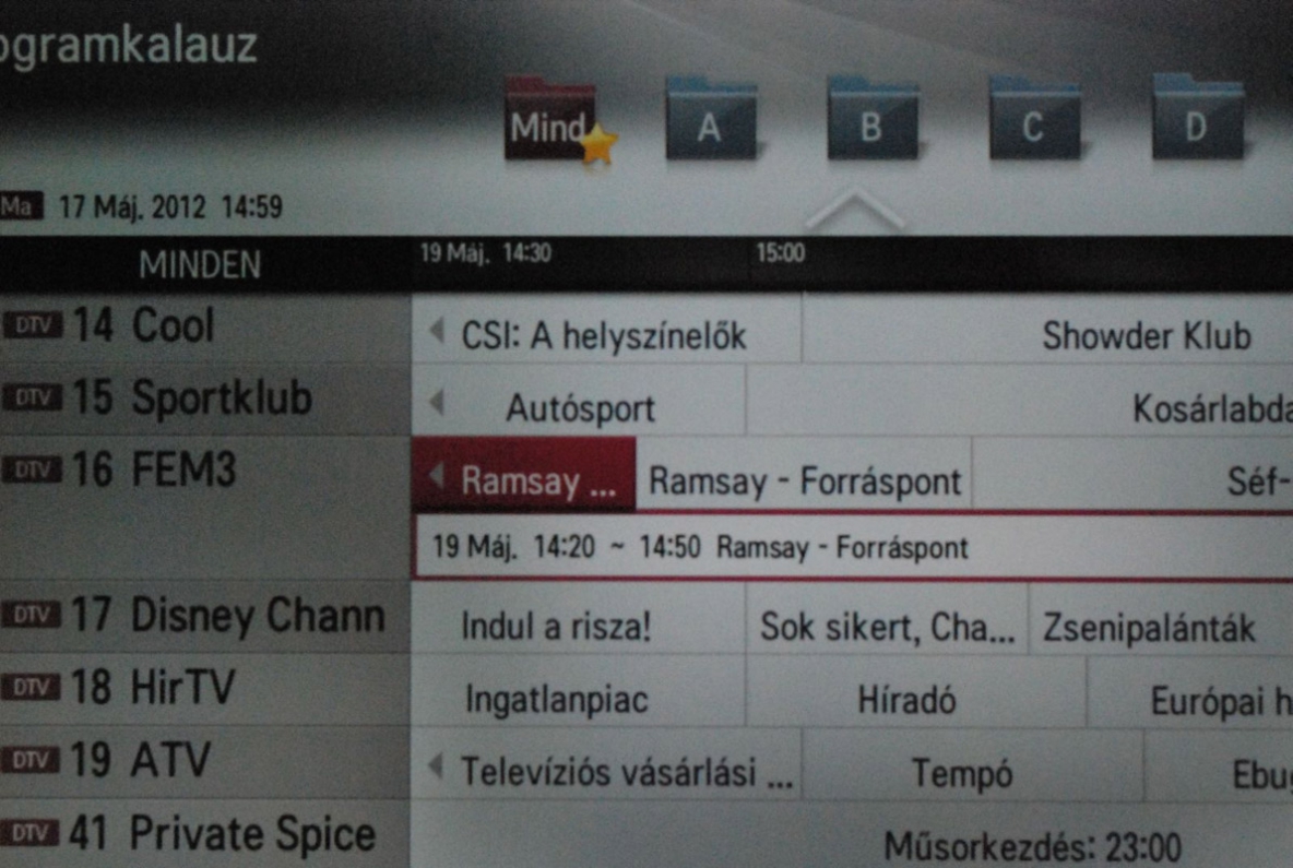 Természetesen az elektronikus programmagazin sem hiányzik, melynek felépítésében a már jól bevált módszert követték: a hasábos rendszer átlátható és logikus. Egyszerre nyolc különböző adó három órányi műsora látható a képernyőn. Sajnos ezek típusuk (tehát például film, sport, hír stb.) szerint nem listázhatóak ki, viszont az Info gomb megnyomásával a kijelölt adás tartalma lekérhető. Persze a műsorrögzítés előre beprogramozása is működik egyetlen gombnyomással, de ennek értelemszerűen feltétele az, hogy legyen csatlakoztatva az USB porton keresztül egy külső merevlemez. Túlzás lenne azt állítani, hogy ez a legszebb EPG a piacon, de használhatónak használható, és ez a lényeg.