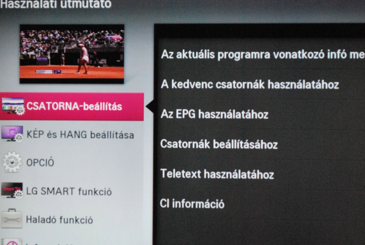 Ezen készülékbe is egy jól sikerült verzió került. A magyarázó szöveg kellően részletes és tömör, a megértést olykor illusztrációk segítik, és még konkrét tanácsokat is kapunk időnként az egyes paraméterek, opciók helyes beállításához. Maga a rendszer érthető, eltévedni nem nagyon lehet. A bal felső sarokban egy kis ablakban fut az aktuális tévéadás, ami remek lehet akkor, ha valaki a reklámszünetet használta fel arra, hogy elmélyedjen valamelyik funkcióban.