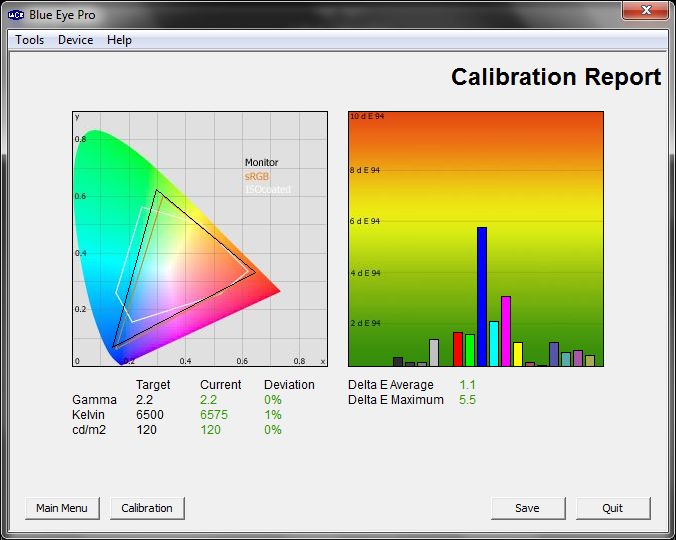 Egy kalibrátorral, illetve a LaCie Blue Eye Pro névre hallgató alkalmazás segítségével vettük szemügyre tüzetesebben az előzetes beállításokat. Sorrendben ezek a következők: Élénk, Játékgép, Intelligens érzékelő, Mozi, Normál. A kép jobb oldalán látható, hogy a bemért 18 szín milyen mértékben tér el a referenciától. Ennek meghatározására használatos a delta E, ami egy olyan numerikus érték, amely két különböző szín távolságát határozza meg egy színrendszeren belül. Minél kisebb a delta E értéke egy adott színnél, annál közelebb áll a referenciához, vagyis annál jobb.