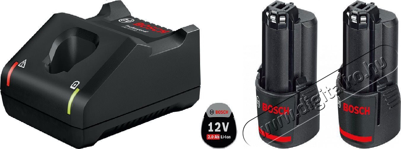 A szett tartalma: 2 db nagy teljesítményű 2 Ah kapacitású Bosch GBA 12V-os akkumulátor + 1 db GAL