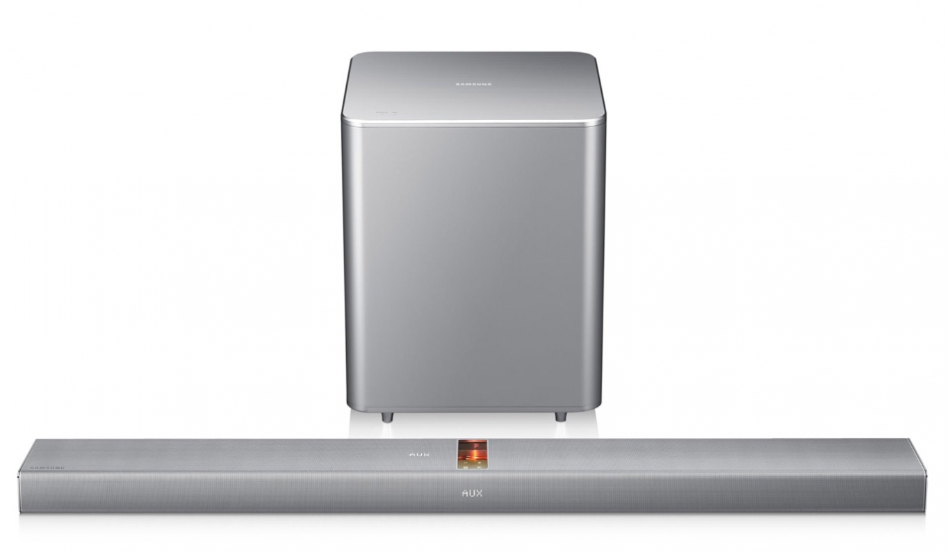 A HW-F751 ezüst színű, vékony fém készülékháza és a különálló, vezeték nélküli mélynyomó tökéletesen illeszkedik a Samsung okostévék prémium designjához.
