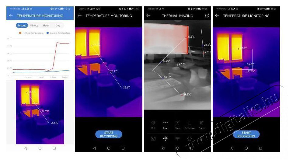 A Topdon TCView hőkamera csatlakoztatható Androidos mobiltelefonokhoz, valamint Windows PC-hez, illetve laptophoz. A Thermal Imaging App alkalmazásban valós idejű hőkamerás képeket tekinthetsz meg az aktuális hőmérséklettel. Ezután pontos hőmérsékleti grafikonokat is készíthetsz. A hőmérsékletmérési tartományt is beállíthatod, például egy egyenes vonalra, több egyenes vonalra, egy kiválasztott területre vagy akár több pontra egyszerre.