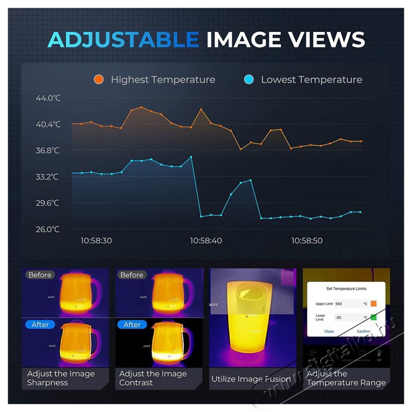 A Topdon TCViewm TC001 hőkamera -20 °C és 550 °C között képes mérni. Így könnyedén használhatod tárgyak és különböző felületek hőmérsékletének mérésére, hőszivárgás észlelésére stb. A hőkamera erőssége a kép tisztasága, amely nagyon nagy, 256 × 180 px-es IR-felbontással büszkélkedhet. A Topdon TCViewm TC001 hőkamerában használt objektív lehetővé teszi a kép elforgatását és az egyéb képjavító funkciókat.