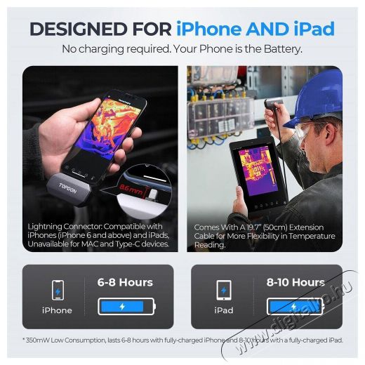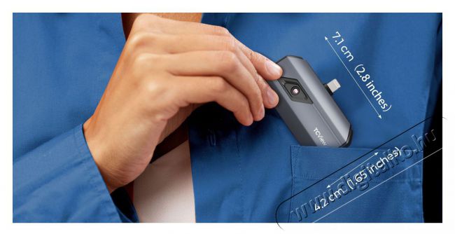 A Topdon TCView TC002 kompakt méretekkel rendelkezik (7,1 × 4,2 × 1,4 cm) és mindössze 30 gramm tömegű. Ezért könnyen használható iPhone-okkal és iPadekkel is. Az alumínium ház védelmet nyújt a leesések ellen. Mivel a Topdon TCView TC002 közvetlenül készülékedhez csatlakozik, nincs szükség saját tápegységre. Az alacsony, 0,35 W-os energiafogyasztás hosszabb akkumulátor-élettartamot biztosít 4-7 órás használat mellett a 3000-5000 mAh-s akkumulátorral rendelkező eszközökön.