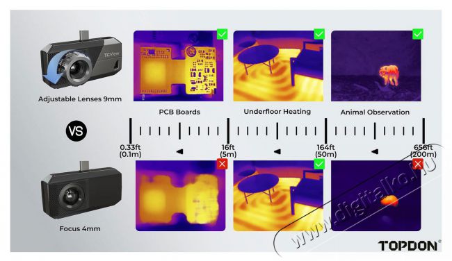 A TOPDON TS001 hőkamerát innovatív, állítható 9 mm-es lencsékkel szerelték fel, amelyek rugalmas és pontos infravörös képalkotást tesznek lehetővé nagy távolságok között. A 0,1 méteres (0,32 láb) és az 500 méteres (1640 láb) távolságok közötti lefedés képességével alkalmas mind a közeli vizsgálatokra, mind a távolabbi célpontok megfigyelésére. A TOPDON TS001 hőkamera ideális a legkülönbözőbb alkalmazásokhoz, a nyomtatott áramköri lapok pontos vizsgálatától kezdve a nagy területek, például épületek vagy természeti környezetek hőingadozásának érzékeléséig.