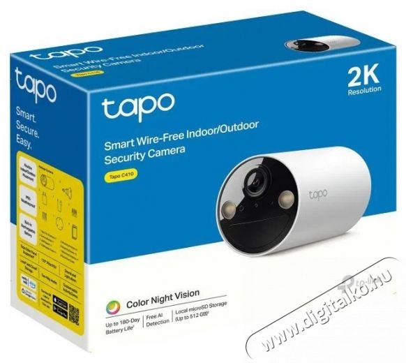 Ennek a biztonsági kamerának a fő előnye a vezeték nélküli telepítés. A TP-Link Tapo C410 akkumulátorról működik, és Wi-Fi-n keresztül csatlakoztathatod a hálózathoz. Ennek köszönhetően szinte bárhová telepítheted, amire szükséged van, függetlenül a konnektor elérhetőségétől.