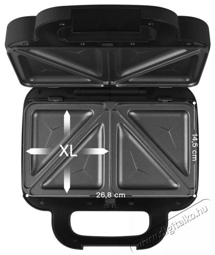 SENCOR SSM 9860BK szendvicssütőHáromszög és négyzet alakú szendvicsek, panini, gofri, palacsinta és mini palacsinta a gyerekeknek. Mindezt pillanatok alatt elkészítheted a Sencor SSM 9860BK szendvicssütővel. 6 cserélhető XL sütőlappal rendelkezik, amelyek mérete 268 × 145 mm. A tapadásmentes felületnek köszönhetően a tisztítás gyors és kényelmes.