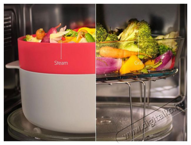 Mikrohullámú sütő, grill- és párolókészlettel: Tökéletes végeredmény és hatékonyság Minden, amit egy mikrohullámú sütőtől elvár, továbbá grillfunkció az ételek megpirításához és az ízletes, ropogós szélekhez. A párlókészlettel hatékony készíthet egészséges ételeket a mikrohullámú sütőben.