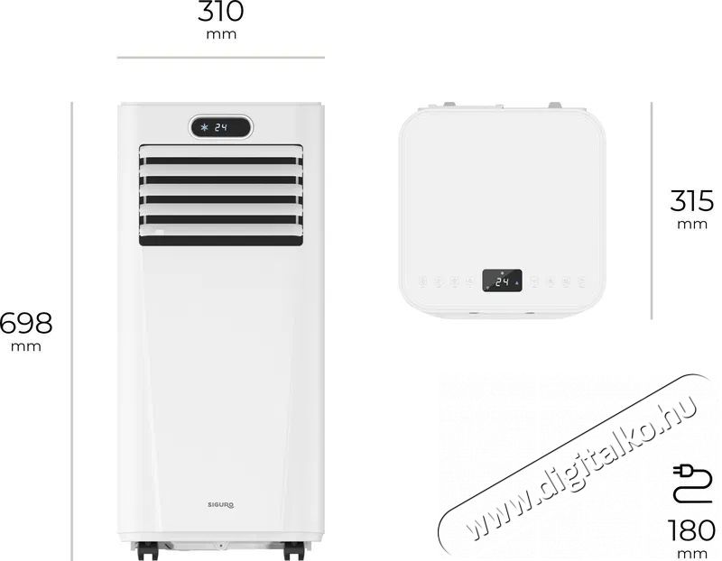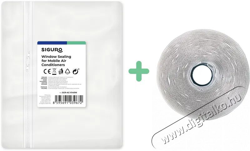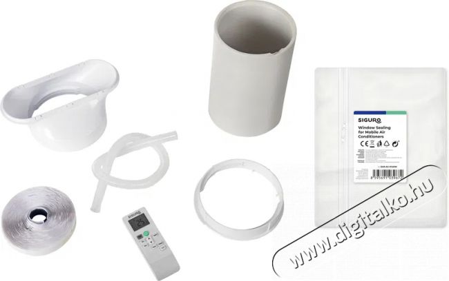 - A csomag tartalma: légkondicionáló, használati útmutató, távirányító (elemekkel együtt), kondenzvíz leengedő tömlő, meleglevegő kivezető tömlő, 2× tömlőadapter, ingyenes ablaktömítés