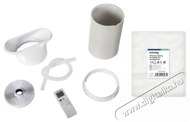 - A csomag tartalma: klíma, használati útmutató, távirányító (elemekkel), elvezető cső, meleg levegő elvezető cső, 2× csőadapter és ablakkészlet