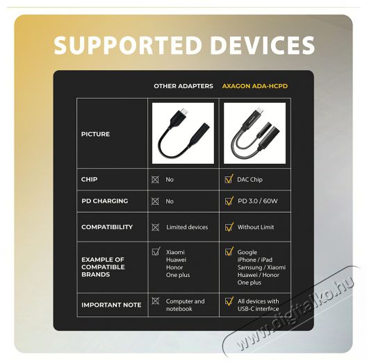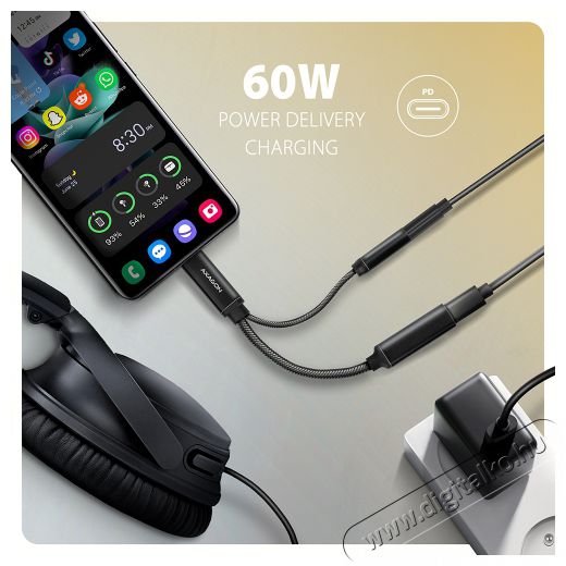 Az AXAGON ADA-HCPD Hi-Res DAC AUDIO ADAPTER a tökéletes kiegészítő telefonodhoz, tabletedhez, laptopodhoz vagy asztali számítógépedhez, amely USB-C csatlakozóval rendelkezik, azonban 3,5 mm-es Jack-kel nem, így azt tudod pótolni. Nagy előnye a beépített Power Delivery csatlakozó, amely lehetővé teszi a töltő egyidejű csatlakoztatását, és lehetőséget biztosít a csatlakoztatott telefon áramellátására. Az adapter tartalmaz egy kiváló minőségű DAC átalakítót, amely a lejátszás során akár 384 kHz/32 bites mintavételezést kínál a kiváló hangminőség érdekében.