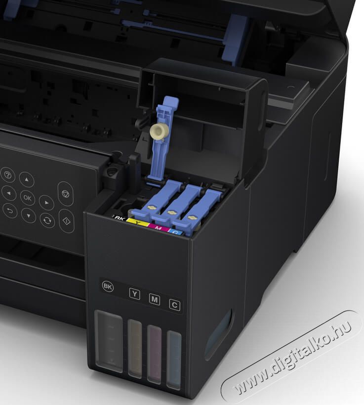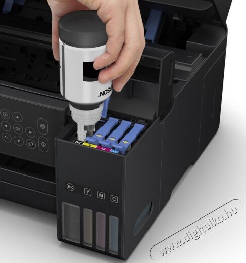 Annak köszönhetően, hogy a tintatartály a nyomtató első részén helyezkedik el, az új kialakítás kompakt, az újratöltéshez egyszerűen hozzá lehet férni, és tisztán látszódnak a tintaszintek. Továbbfejlesztett tintafeltöltő rendszer jellemzi, amelyet úgy terveztünk, hogy minimalizáljuk a kifröccsenést és a koszt. Az új palackok egyesítenek egy olyan mechanizmust, amely csupán azt biztosítja, hogy a tartályokba a megfelelő tinta kerüljön. A fekete pigmenttintákkal és a beivódó színes tintákkal pedig éles, kristálytiszta szövegű és élénk színű nyomatokat állít elő.
