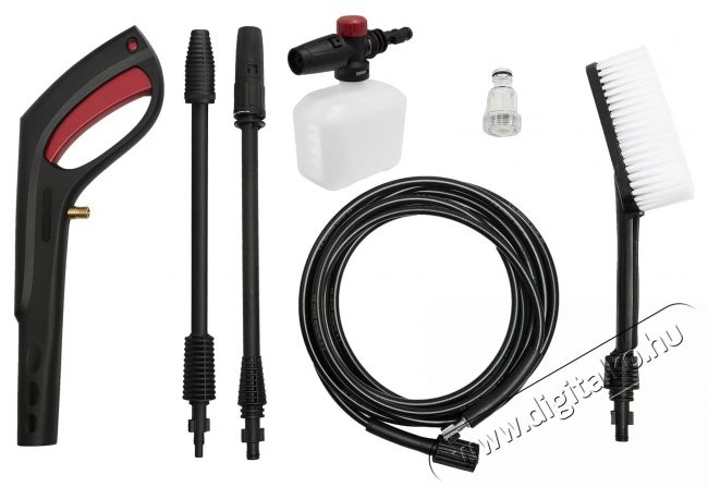 | Csomag tartalma | 1 x Magasnyomású mosó 1 x Mosószer tartály 1 x Pisztoly 1 x Tömlő 5 m 1 x Tömlő orsó 1 x Lándzsa kefével 1 x Gyorscsatlakozó adapter vízszűrővel 1 x Multi-Jet lándzsa 1 x Turbo lándzsa |
