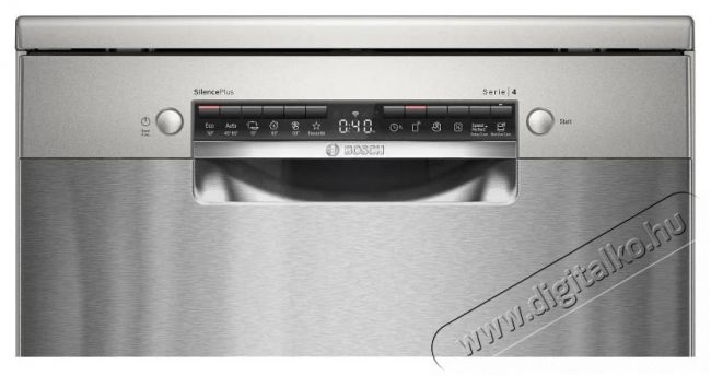 BOSCH SMS4ENI06E Serie 4A mosogatógép használatával munkát, vizet és időt takaríthatsz meg. A standard (60 cm széles) Bosch mosogatógép elsősorban olyan háztartásokba ideális, ahol sűrűn főznek. A szabadonálló mosogatógép bárhová elhelyezhető, ahol van a közelben áramcsatlakozó, szennyvízlefolyó és vízbekötés. Az ajtó elülső oldalán lévő vezérlőpanel akkor is lehetővé teszi a vezérlést, amikor a készülék ajtaja csukva van. Ez az adott BOSCH SMS4ENI06E Serie 4 a köv. energiaosztályba tartozik: B. Ezenfelül alacsony energiafogyasztás mellett magas mosogatási minőséget garantál. Az ECO program éves energiafelhasználása körülbelül 64 kWh. Ciklusonként legfeljebb 13 darab teríték mosogatható el vele. Egyetlen ECO ciklus időtartama 3,58 óra. A mosogatógép sokkalta kevesebb vizet fogyaszt, mint amennyi elhasználódik a kézi mosogatás folyamán. Az ECO mosogatási program ciklusonkénti vízfogyasztása 9 l. Eltávolítható fedelének hála egyszerűbben be tudod tenni a konyhapult alá. Ezen Bosch mosogatógép mérete 84,5 × 60 × 60 cm (ma×szé×mé).