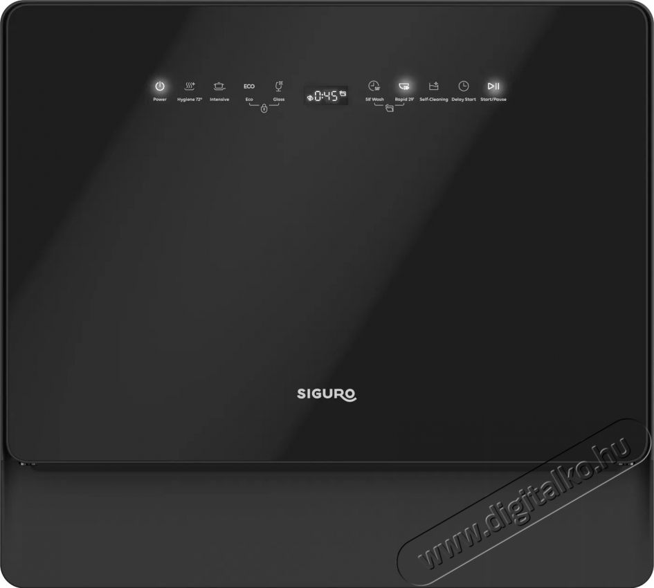 A SIGURO SGR-DW-T352B Compact Wash mosogatógép felhasználóbarát, így az összes funkció és program kényelmesen beállítható az érintésvezérlésű kezelőpanelen. Egy fehér háttérvilágítású, információs LED kijelző is található rajta. A mosogatógép jelzőfényekkel figyelmeztet, ha só- vagy öblítőszerhiányt érzékel. További előnyei az akár 24 órás késleltetett indítás, valamint a gyermekzár is.