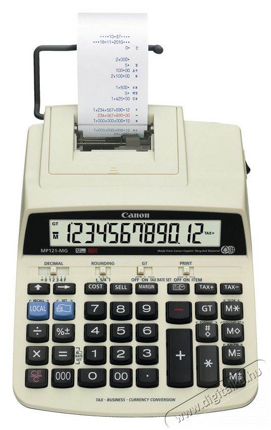 MP121-MGAz újrahasznosított anyagból készült, 12 helyértékes, 2 színű nyomtatásra képes számológép professzionális funkciók sorával, pl. időkímélő üzleti, adószámító, és valutaváltó funkcióval rendelkezik.